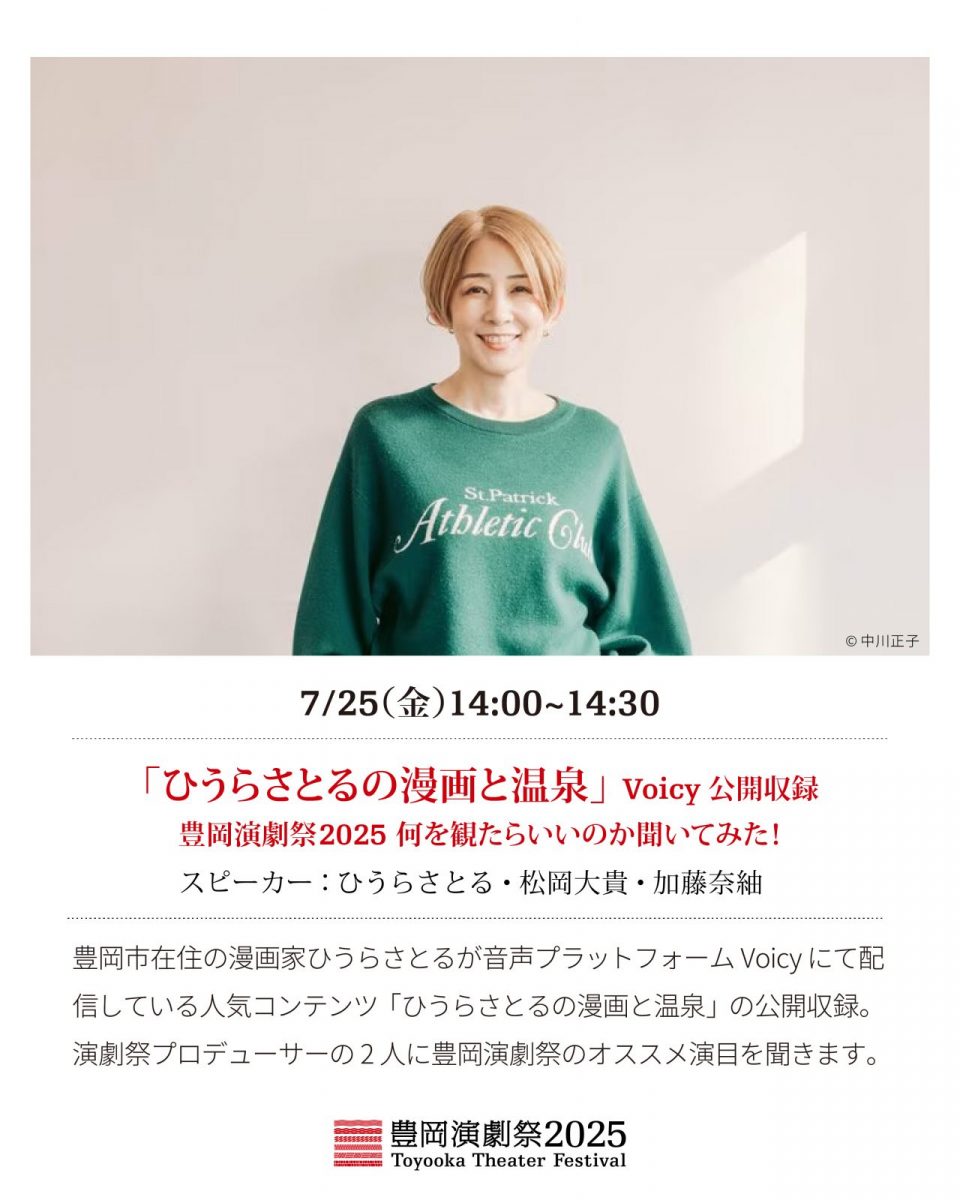 豊岡市在住の漫画家ひうらさとるさんが音声プラットフォームVoicyにて配信している人気コンテンツ「ひうらさとるの漫画と温泉」の公開収録。演劇祭プロデューサーの2人に豊岡演劇祭のオススメ演目を聞きます。