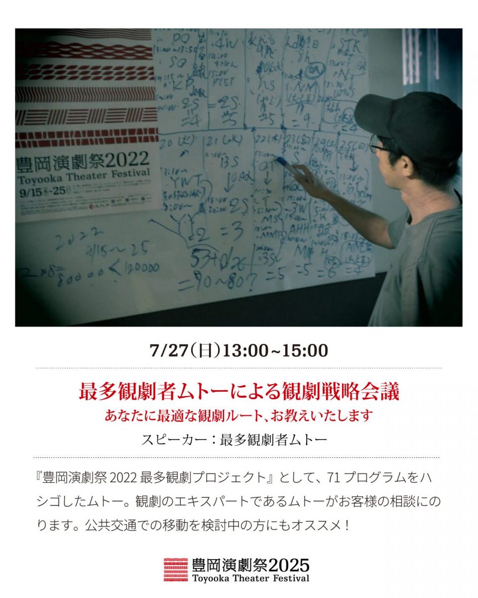 豊岡演劇祭2022にて『豊岡演劇祭2022最多観劇プロジェクト』として、71のプログラムを観劇・参加した最多観劇者ムトー。豊岡演劇祭観劇のエキスパートであるムトーがお客様の相談にのります。公共交通での移動を検討中の方にもオススメ!途中参加・途中退席出入り自由です。お気軽におこしください!