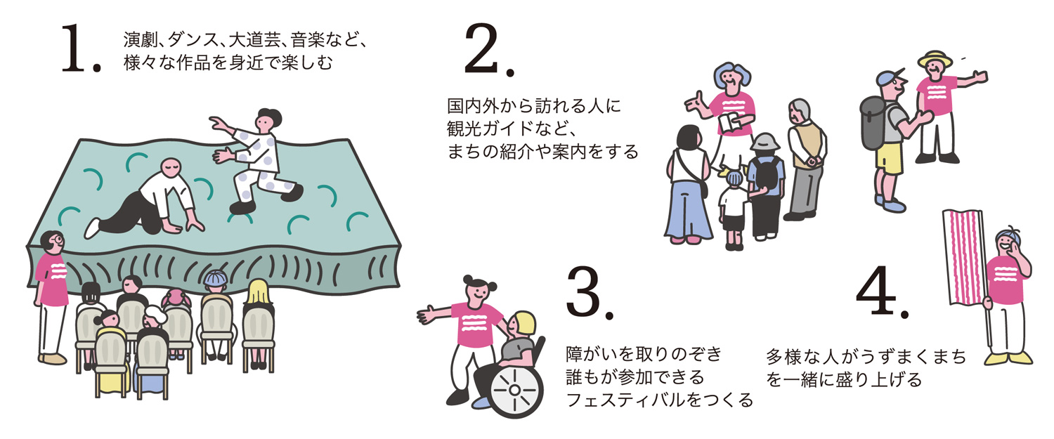 プログラム運営のサポートに加え、来訪者にまちの魅力を紹介し、作品・地域とのつながりをサポートします。