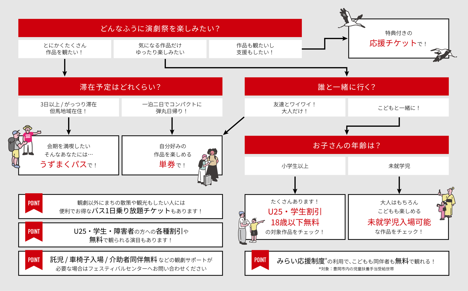演目ごとにチケットを購入する「単券」、公式プログラムやフリンジプログラムをお得に観ることができる「うずまくパス」、演目を観るだけでなく豊岡演劇祭を応援してくださる方に向けた「応援チケット」、団体での観劇に便利な「団体チケット」の4種類。
