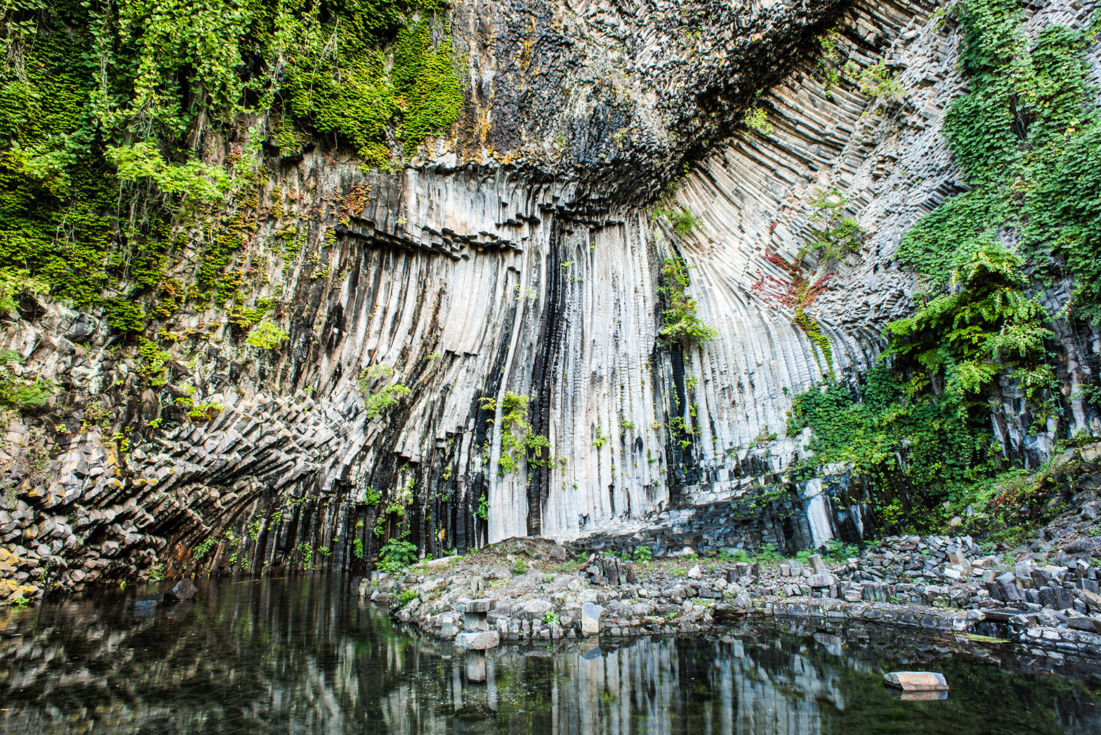 国の天然記念物に指定されている洞窟で、約160万年前の噴火によって流れ出た溶岩が固まって出来た玄武岩の柱状節理が特徴的です。かつては採石場として利用され、ここで切り出された石を利用した石材や石積みが市内に今でも残ります。